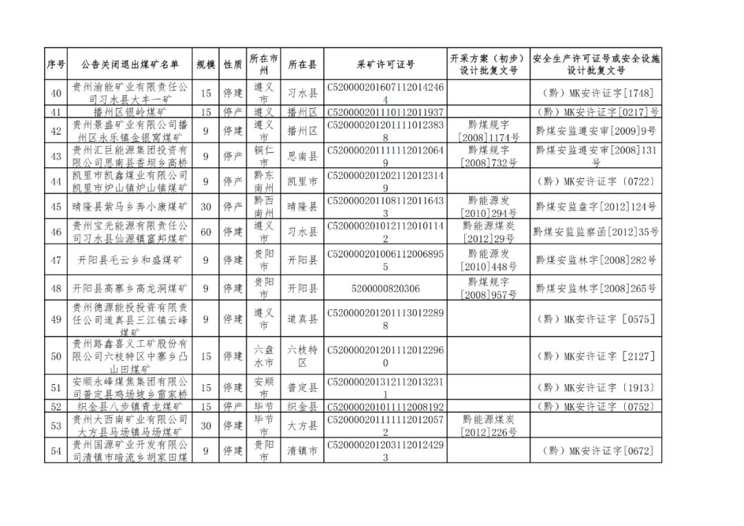 贵州省能源局要求,各市(州)、有关县(市、区、特区)人民政府要高度重视煤矿关闭工作,10日内将煤矿关闭进度计划报送省煤炭工业淘汰落后产能加快转型升级工作领导小组办公室(贵州省能源局)。公告关闭煤矿原则上2020年8月底前完成物理封闭。