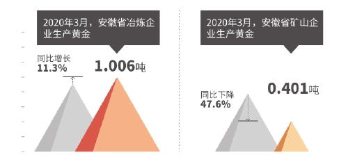3月,安徽省冶炼企业生产黄金1.006吨,同比增长11.3%。但受金冠铜业分公司奥炉厂区大修、金隆铜业有限公司因新冠肺炎疫情致原料供应不足等因素影响,环比仍下降23.3%;矿山企业生产黄金0.401吨,同比虽下降47.6%,但得益于矿山企业陆续复工复产,环比增长73.1%。