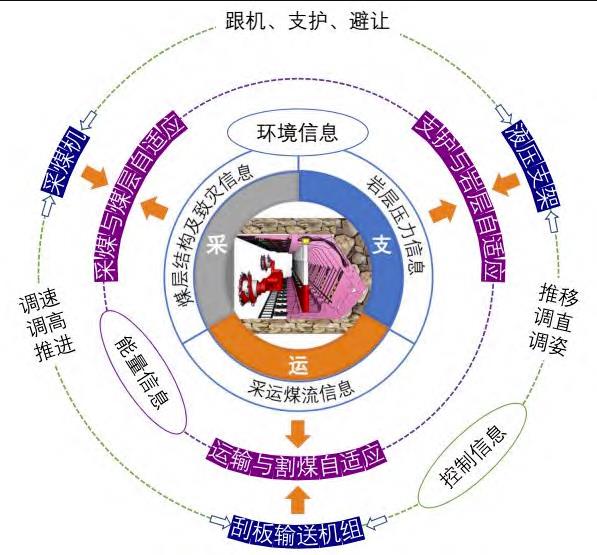研究首次将智采工作面复杂信息归纳为环境信息流、控制信息流和能量信息流三条信息流,用来描述采煤过程的环境、控制和能量状态。环境信息流和控制信息流来自煤岩体对采煤机、液压支架、煤流运输机组的输入信息及其调控信息,能量信息流来自开采装备对煤层、岩层变量调控所产生的能量交换状态信息。