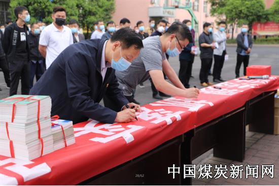 活动现场,笔者看到该矿党委副书记、纪委书记、工会主席李俊岭和副矿长曹伐柯向职工们授《煤矿安全规程》、《掘进工》、《通防工》、《输送机》等相关书籍800余套,随后,职工们在印有“平禹一矿学法规、抓落实、强管理”横幅上签上了自己的名字。