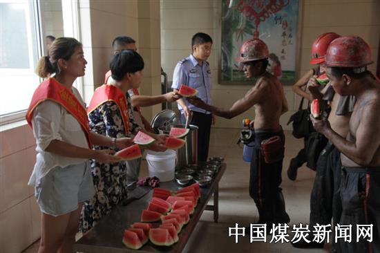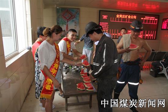 炎炎夏日送清凉,丝丝关爱入心田。连日来,面对持续的高温天气,团员青年志愿者们将一碗碗绿豆汤、一块块西瓜送到了上下井职工的手中,一份份清凉,一张张笑脸、一句句安全贴心话语,无不寄托着公司党政和团委组织对安全生产的祝福及期望。活动的开展不仅送去了组织的清凉和关怀,更是极大的激发了一线职工的干劲与激情,赢得了广大职工的好评。图为青年团员在井口为职工送西瓜