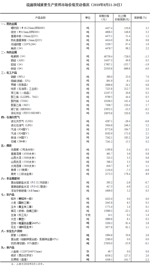 中国网财经8月24日讯 国家统计局网站今日公布2018年8月中旬流通领域重要生产资料市场价格变动情况。据对24个省(区、市)流通领域9大类50种重要生产资料市场价格的监测显示,2018年8月中旬与8月上旬相比,34种产品价格上涨,13种下降,3种持平。