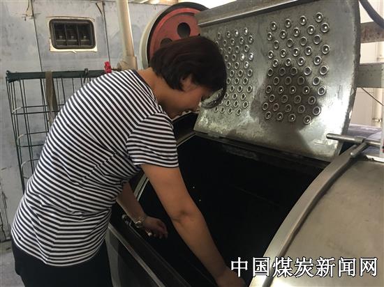 没去过洗衣房的人,体会不到洗衣女工的辛苦,虽然说现在洗衣房的大部分工作都实现了机器化,但是下井职工在工作中难免会沾到煤泥和油渍等污物,她们就单独用碱水浸泡后,再一点点将其搓洗干净,并记好工作服号,等到烘干出来时再进行检查洗得是否干净,直到洗干净为止。瘦小的她们,每个班下来,都累的腰酸背疼。特别是到了夏天,由于特殊的工作环境,烘干箱散发出的热浪扑面而来,温度高达50度,当清洗的衣服全部挂好时,她们全身都是汗水,连内衣都湿透了。尽管如此,她们依然会微笑面对每位上下井职工。在衣服洗涤、烘干过程中他们总是仔细查找丢扭扣、开裂、破损的衣服,当班及时缝补,做好上架前各项任务。