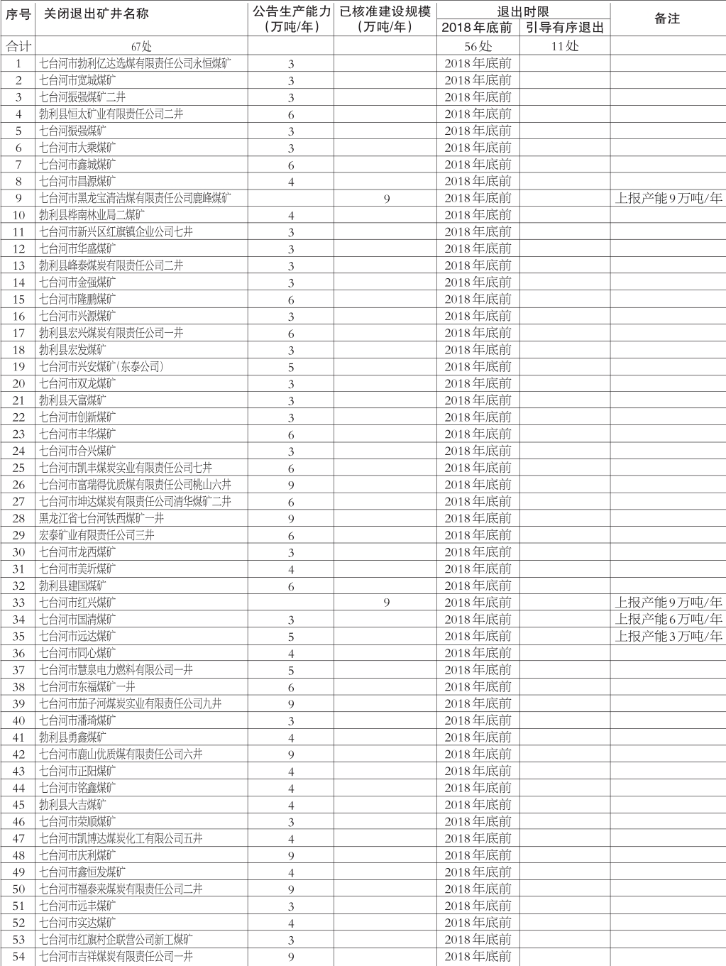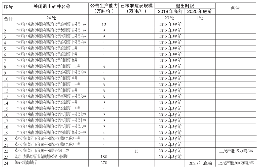 根据黑龙江省煤炭行业淘汰落后产能化解过剩产能专项整治工作领导小组办公室文件《关于龙煤集团煤炭行业淘汰落后产能关闭煤矿台账的批复(第一批)》之文件精神(黑煤整治办发[2018]22号),下列24处煤矿符合关闭条件,其中,2018年底前关闭23处,2020年底前关闭1处,特此公告。附龙煤集团关闭煤矿名单: