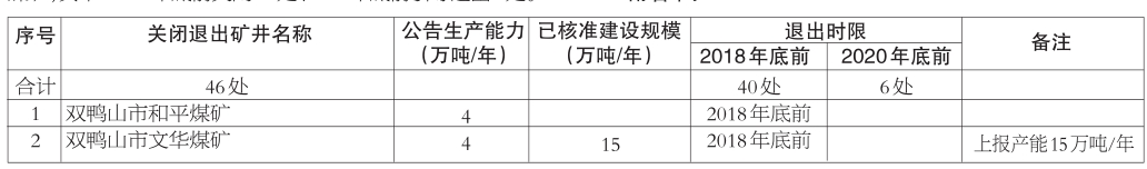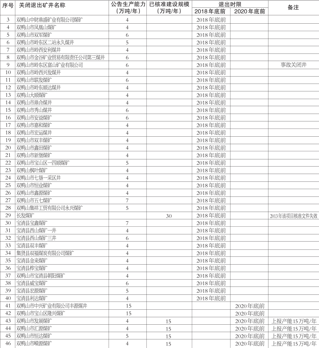 黑龙江省煤炭行业淘汰落后产能化解过剩产能专项整治工作领导小组办公室对双鸭山市关闭小煤矿台账进行审查后,于8月20日以黑煤整治办发〔2018〕19号文件予以批复。省专项整治工作领导小组办公室原则同意关闭双鸭山市和平煤矿等46处小煤矿,其中:2018年底前关闭40处、2020年底前引导退出6处。
