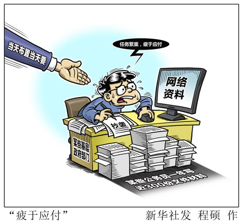 湖北省某县委政研室干部说,一些党员干部特别是领导干部能力不济,把发文、开会当作抓落实的主要方式方法,甚至将其做成履职尽责、推卸责任的“痕迹”,一些文件层层转发、照抄照转,很多时候并无新的实质性内容,完全是重复上级精神,造成基层干部有看不完的文件、开不完的会。