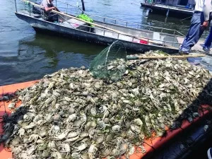 ▲渔民将死蟹清理出水,一船一船运走。图片来源:现代快报