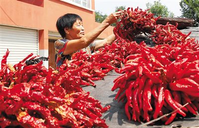 位于河南省新安县北冶镇的马行沟村曾因开采铝土矿而满目疮痍。近年来,马行沟村在相关部门的支持下,开展废旧矿山植被恢复,昔日的矿区种上了经济作物和景观作物,治理修复后的矿区旁建设了搬迁惠民小区,配套休闲广场、健身器材等设施。经过综合性治理,曾经的废弃矿山“变身”绿色家园。图为近日该村惠民小区居民在晾晒辣椒。