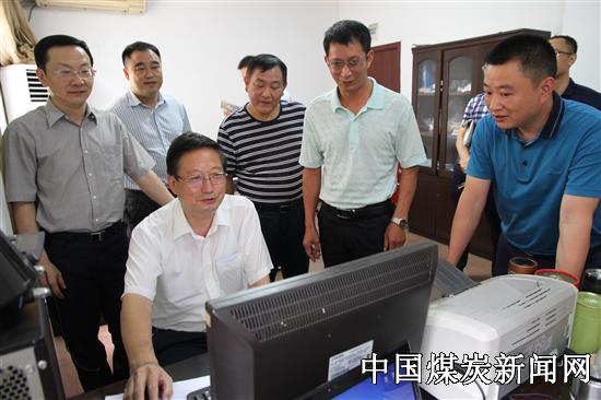 图为宋元明副局长(前)在调看驻矿安全监员隐患排查情况