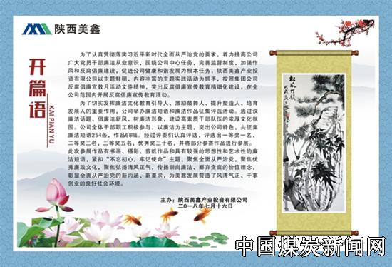【本网讯】为了贯彻落实习近平新时代全面从严治党的要求,进一步提高美鑫公司广大党员干部廉洁从业意识,突出反腐倡廉宣传教育精细化建设。美鑫公司6月份在全公司开展了廉洁作品、廉洁短语征集活动。此次活动坚持以党的十九大精神和习近平新时代中国特色社会主义思想为指导,深入贯彻集团公司党风廉政建设暨纪检监察工作会议精神。严肃党内政治生活,强化“两个责任”,坚持把纪律和规矩挺在前面,进一步教育引导全体干部员工遵守企业规章制度,自觉做到忠诚、干净、担当,以优良的作风助力公司建设发展营造清爽的政治生态。