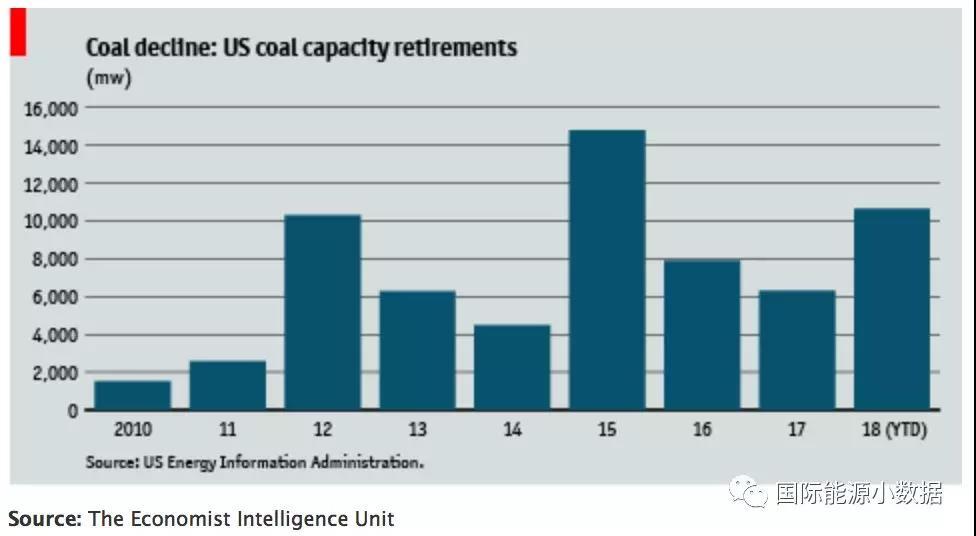 中国储能网讯:来自美国能源信息署(EIA)的数据显示,2017年1月至2018年6月已退役约17,000兆瓦(MW)的燃煤电厂。在特朗普任职的第一年2017年就有6,300兆瓦退役,而在2018年的前6个月退役煤电已达到10,650兆瓦左右。 而在2012年至2016年期间,约有43,000兆瓦的煤炭产能退役,因此尽管特朗普为燃煤电力行业创造的政策环境更为积极,但自2017年以来美国煤电延续了退役的势头。