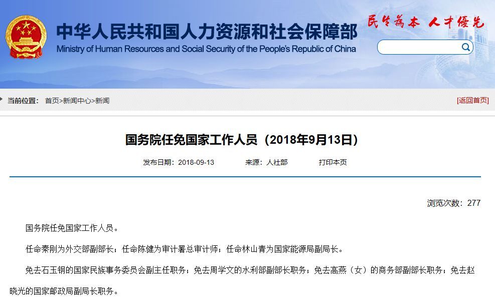 免去石玉钢的国家民族事务委员会副主任职务;免去周学文的水利部副部长职务;免去高燕(女)的商务部副部长职务;免去赵晓光的国家邮政局副局长职务。