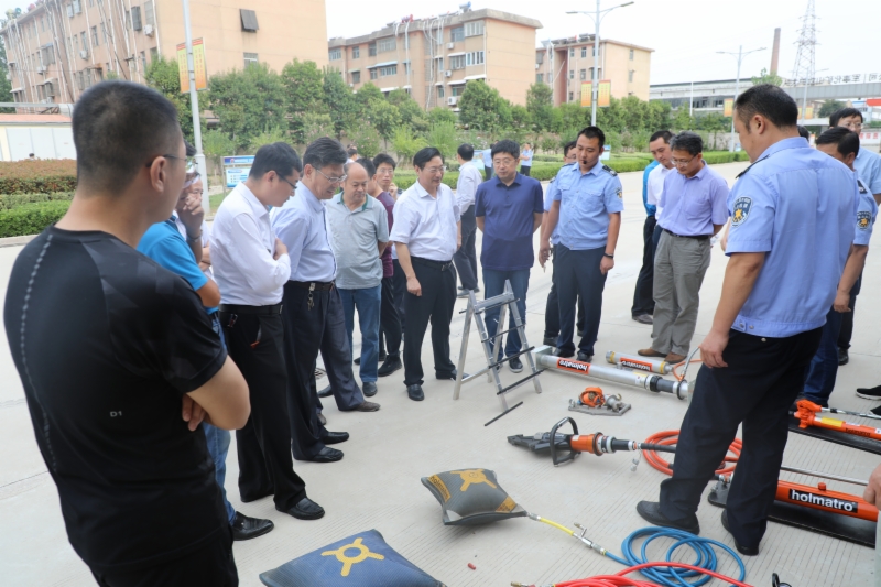 在救护大队全体同志先后听取大队简要介绍,历年救援案例汇报,现场参观调度指挥系统、救援演练与评价系统、装备库、卫星指挥车、地下演习巷道、体训馆等,最后在职工培训中心,观看了救护指战员进行的压缩氧自救器和化学氧自救器的讲解和佩戴演示。