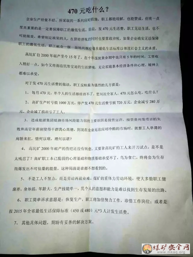 高坑煤矿职工:企业生产经营不好,所采取的一系列应对措施,职工都能理解,也能赞成,但有一点至关重要的是一定要保障职工的最低生活,目前,发470元生活费,职工无法生活,也不能接受,希望制定政策的人,在算经济账的同时也要算好其他的帐!(具体内容请放大上面图片看看!)