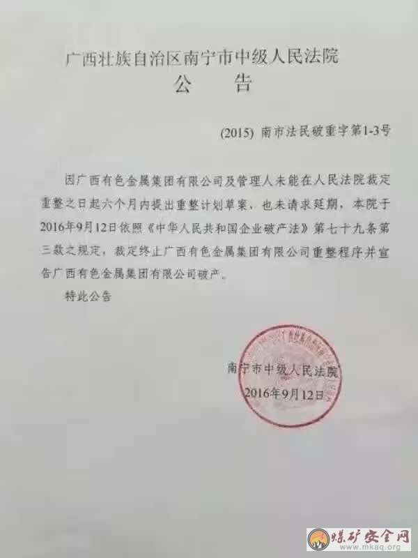 至6月23日,6个月破产重整期限已满,重整方案始终未出台。法院方面未于第一时间进行裁定,一直至9月12日才下发公告宣告广西有色破产。