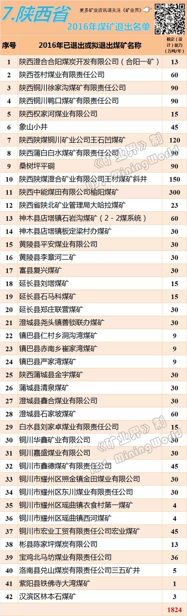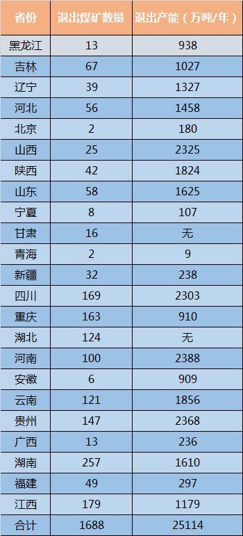 据《矿业界》统计,今年我国煤炭行业退出或拟退出煤矿数量达1688家,退出产能达25114万吨/年,全年煤炭去产能取得重大成果。