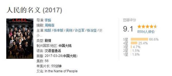 《人民的名义》刚播出4集,就已经吸引了大批观众,豆瓣评分高达9.1分,首播2.41的全国网收视率,坐稳同时段节目收视第一的宝座。这部剧的编剧是曾写过《人间正道》《绝对权力》和《国家公诉》等政治小说的周梅森,创作过程可谓“潜心八年,六易其稿”,播出后不少观众称赞“看得超过瘾”。
