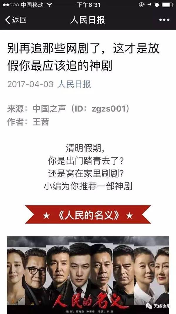 据权威数据显示,《人民的名义》开播首日就冲入CSM52城电视剧收视率排行榜前三。微博话题阅读量已达2.1亿,讨论26.1万余次,并得到众多网友“安利”: