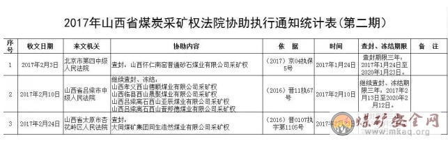 查封大同煤矿集团同生浩然煤业有限公司采矿权,来文机关:山西省太原市杏花岭区人民法院,查封期限三年:2017年2月23日至2020年2月22日。