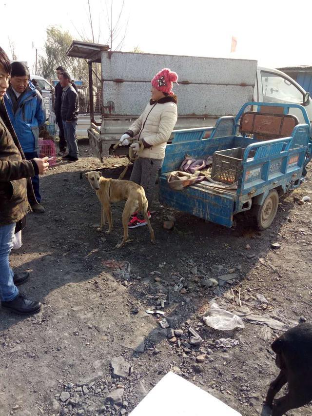 这位农村大姐手里牵着个狗狗,她说是自己家里养的马犬,家里还有10多个,谁要就牵走,价格1500元。好多人围着看。