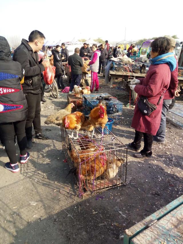 这位农村大姐在出售家养的老母鸡,她说鸡龄都在3年以上,25元钱一斤。有几位顾客站在老母鸡旁边看,想买,又拿不定主意。