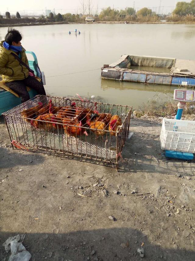 这位大姐在出售红公鸡,她说是自己家养的,鸡龄1年,20元钱一斤。
