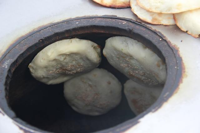 徐玉梅用铁钳子把烤熟的烧饼拿出来。