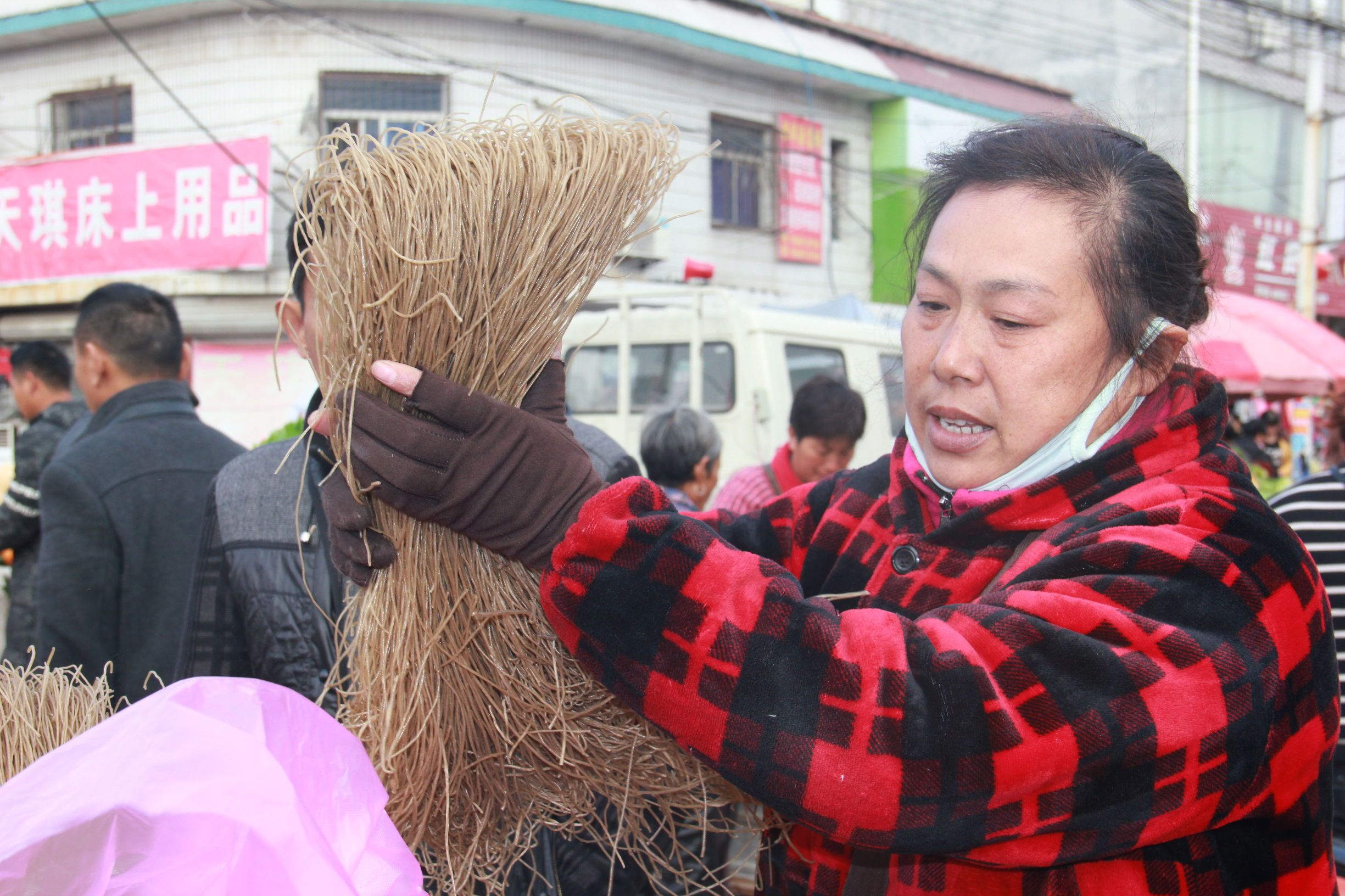 农村大姐手里拿出一把粉丝,在向顾客推销、展示。这是她的劳动成果,是用汗水和辛勤换来的。