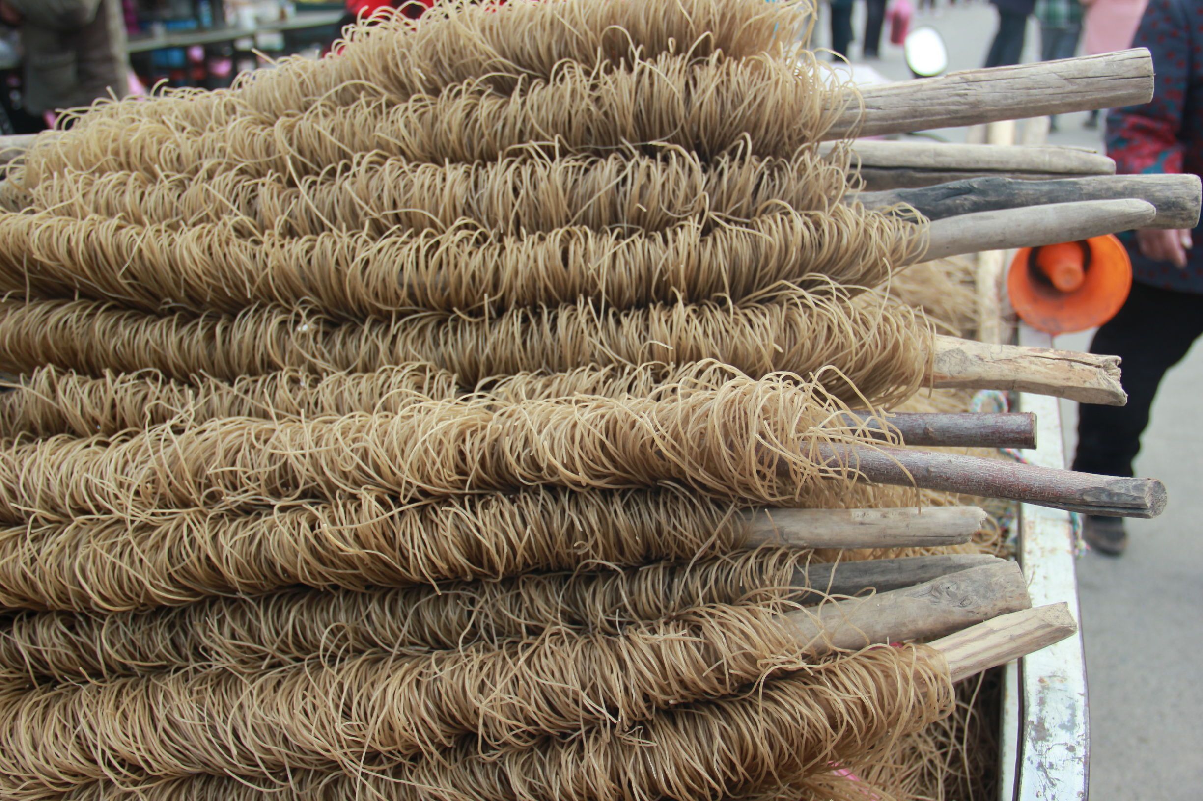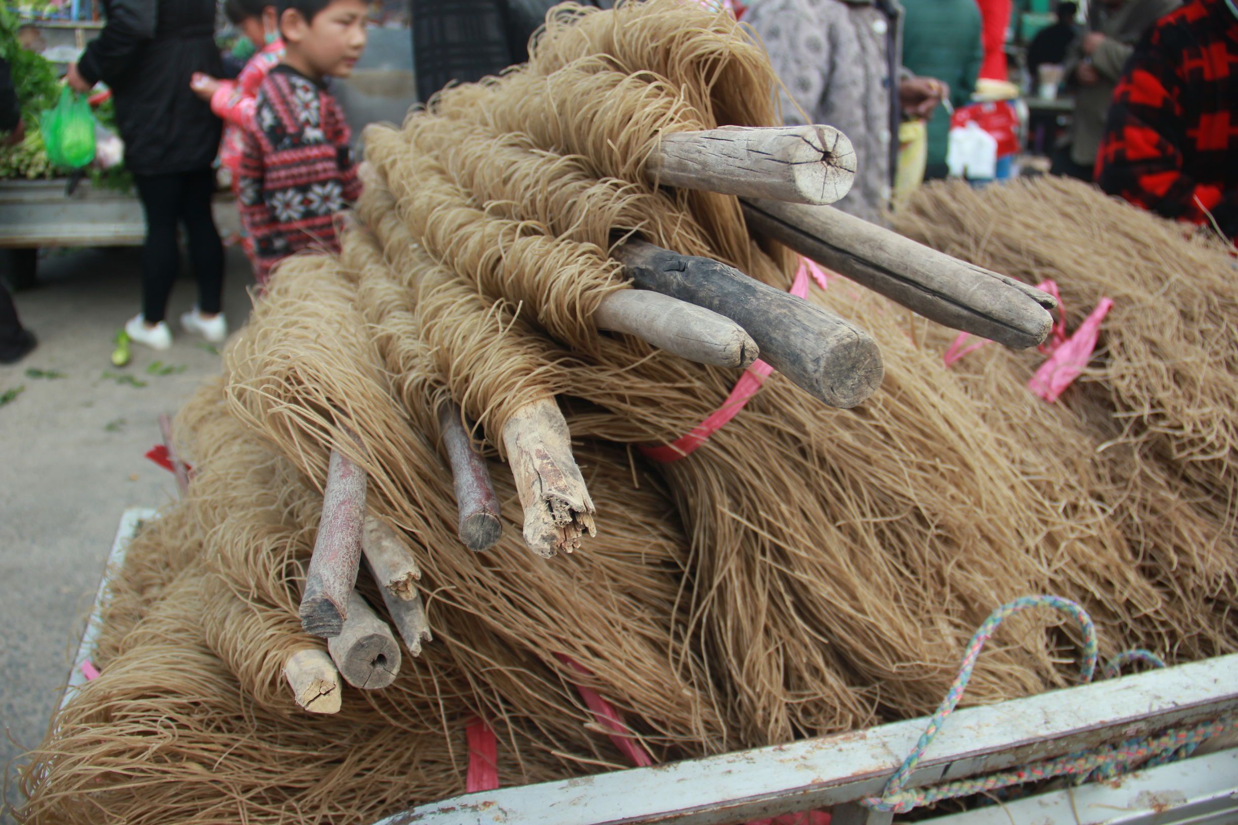 这是农村大姐自己家制作的粉丝,纯红薯粉丝,货真价实,6元钱一斤,不还价。粉丝上缠绕着木棒,显得淳朴亲切,有一股浓浓的乡情扑面而来。