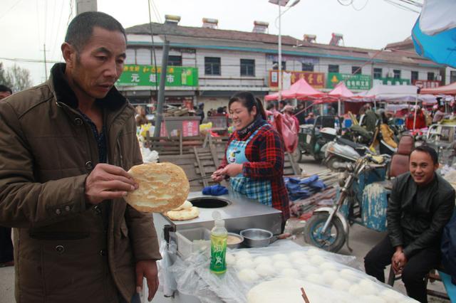 这个图片中的女人叫徐玉梅,坐在一旁的是她爱人,小两口在农村大集上打烧饼卖。小两口诚信经营,热情好客,生意做的红红火火,天天都有人专程来这里买她的烧饼。图中这位农民大哥经过徐玉梅的摊位前,买了一个烧饼,拿在手里正准备吃,他神情依然,若有所思,好像在想着什么。
