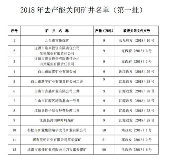 近日,吉林省安全生产监督管理局发布通告。按照《国务院关于煤炭行业化解过剩产能实现脱困发展的意见》(国发〔2016〕7号)及国家发改委等部门关于煤炭行业去产能一系列文件精神,长春市九台区人民政府、辽源市西安区人民政府、白山市浑江区人民政府、江源区人民政府、靖宇县人民政府、延边州珲春市人民政府、白城市洮南市人民政府根据相关要求,对九台市官地煤矿等12处矿井予以关闭。