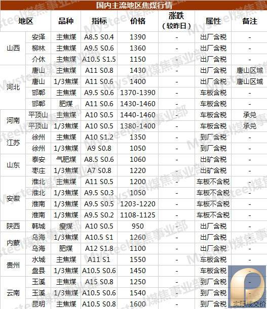 云南玉溪仙福钢铁焦炭采购价普涨,准二级A14报2350元/吨涨50元/吨,等外焦A18报1979元/吨涨30元/吨,均干基到厂含税价,16日执行。 云南曲靖地区焦炭价格普涨,准二级焦2260涨50元/吨,等外焦1900元/吨涨30元/吨,均干基出厂含税价,16日执行。 江苏徐州地区焦炭采购价格持稳,现二级A13,S0.7,CSR50,CRI35采购到厂含税1950元/吨。 蒙古焦煤成交一般,报价涨,现蒙3#1500元/吨,蒙5#1480元/吨,均为唐山到厂报价。 炼 焦 煤 市 场 20日国内炼焦煤市场持稳运行。煤矿方面部分原煤价格略有上调,精煤价格持稳为主,进口焦煤价格较高,部分企业小幅跟涨;焦化厂方面焦炭市场走强,钢厂利润收窄,焦钢博弈加剧,焦企挺价压力增大。综合考虑,预计短期国内主流炼焦煤现货市场持稳为主。 |