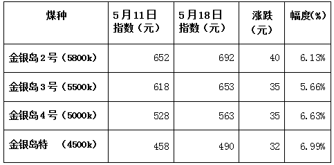 截至5月18日,总场存1853.5万吨,环比增加79.6万吨,幅度4.49%。秦皇岛港库存量538.5万吨,维持历史同期较高水平。水泥化工等行业的终端客户积极采购各港口优质山西煤,较蒙陕煤更为紧俏,供不应求增加了贸易商囤货待涨的信心,促使现货价格持续走高。与此同时,港口贸易商报价也呈现多样化,囤煤捂货惜售情绪延续,询价远多于现货成交,导致市场煤价格持续上涨。