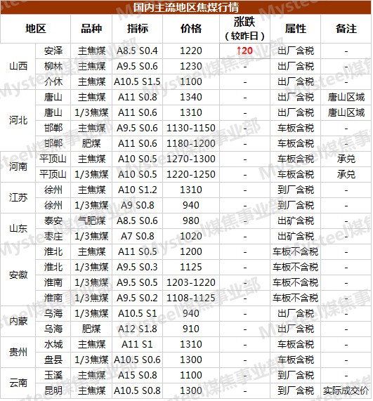 今日煤焦市场行情 河北邯郸地区焦炭价格上涨50元/吨基本落实,现准一焦报1650,二级报1600元/吨,高硫报1570元/吨,均出厂含税价。 山西安泽地区部分炼焦煤提涨20元/吨,提涨后低硫主焦煤A10.5,S0.4,V25,G85,Y16出厂含税报1220元/吨,暂无成交。 山西临汾焦炭市场暂稳运行,现准一焦CSR60报1530元/吨左右,二级焦CSR55报1480元/吨左右,均出厂含税。 江苏徐州地区冶金焦价格持稳,现二级报1650-1670元/吨;准一级报1730-1750元/吨,均为现汇出厂含税价。 江苏徐州地区焦粉焦粒价格持稳,现焦粉报1050-1100元/吨;焦粒报1300-1350元/吨,均为出厂含税价。 青海天峻地区炼焦煤市场稳定,现高灰主焦煤A25.5报450元/吨,1/3焦煤报680元/吨,1/2中粘煤报610元/吨,均原煤坑口含税价。 炼 焦 煤 市 场 28日国内炼焦煤市场暂稳运行。今日山西安泽地区部分炼焦煤提涨20元/吨,提涨后低硫主焦煤A10.5,S0.4,V25,G85,Y16出厂含税报1220元/吨,暂无成交。煤矿方面心态略有转好,下游焦炭开始上涨给予煤矿信心,部分煤矿有提涨意向;焦化厂方面部分地区焦炭小幅提涨,已有个别钢厂接受上涨。综合考虑,预计短期国内主流炼焦煤现货市场或将持稳运行。 |