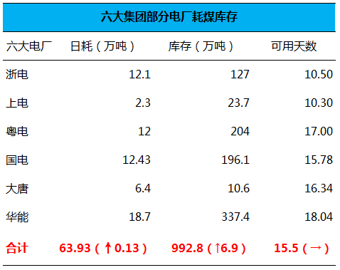 三、六大集团部分电厂日耗、库存、可用天数: