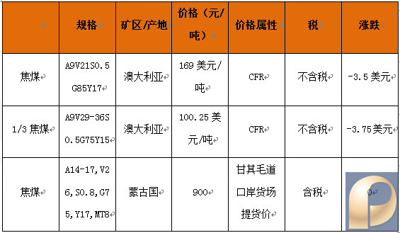 目前焦煤市场需求虽然开始好转,但部分主流煤企焦煤价格仍有零星补跌,其中山西离柳焦煤集团焦煤价格下调30元/吨左右,贵州盘江煤电焦煤价格补跌100元/吨,河北开滦集团针对地销客户价格下调20-50元/吨不等,另外山西焦煤集团焦煤焦煤价格暂稳观望为主。 2.国外 表2. 国际炼焦煤主流价格