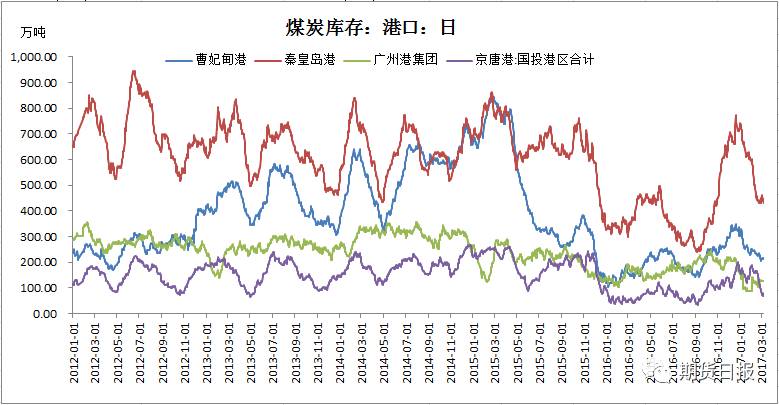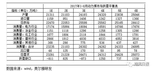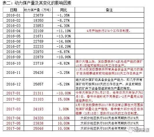 二季度动力煤将供给过剩3326万吨 根据历年各月份动力煤产量、进口量、消费量和出口、季节性因素和后期供需可能的增速预测1月供给缺口811万吨,2月供给过剩825万吨,3月供给缺口为873万吨,4月供应过剩1250万吨,5月供给过剩737万吨,6月供给过剩1339万吨。 二季度动力煤产量同比增10% 去年4月份煤矿开始全面执行276个工作日制度,动力煤产量同比降幅达到13%左右,其中7月动力煤产量同比降幅达到16%,产量大幅收缩,供不应求,煤价持续大幅上涨,为了保障下游电厂和钢厂煤炭冬储,发改委表示74家先进产能的煤矿自10月1日起均可按照330天的工作日生产,煤炭产量有所释放,10月动力煤产量同比下降8.82%,降幅收窄。 动力煤仍有供需缺口且叠加汽运限载火车车皮不足,煤价继续大幅上涨。为了平抑煤价保障冬季煤炭供应,11月16日发改委表示在供暖季结束前具备安全生产能力的煤矿均能按照330天工作日生产,并且因煤价大幅上涨煤矿利润回升(发改委2017年1月25日表示预计2016年规模以上煤企实现利润950亿,约为2015年的2.1倍),煤矿借此机会大力购买井下设备,加大投资,使得煤炭产量大幅回升,11月动力煤产量同比降幅为3.25%, 12月动力煤产量同比降幅为5.28%,降幅收窄。 从产量的数据我们可以看出,真正影响产量的是煤矿276个工作日制度而不是去产能的目标。考虑到2017年农历除夕为1月27日,去年农历除夕为2月7日,煤矿休假时间不同,笔者预测1月产量为21311,同比下降10%,2月产量21103万吨,同比增加15%,3月产量24193万吨同比增加1%,考虑到3月中旬后大部分地区继续执行330天的工作日制度以及4月中旬前所有煤矿完成自检和所有煤矿3月至8月专项整治超层越界开采,4-6月产量同比增加10%。4-6月的产量分别是24320万吨、23838万吨和25046万吨。 图1:动力煤产量走势图 数据来源:wind,美尔雅研发 动力煤进出口 根据历年各月份动力煤的进口量、季节性因素以及国外矿山盈利和复产情况预计二季度动力煤进口量为3935万吨,同比增加40%。 图2:2015、2016和2017年各月份动力煤进口量柱形图 数据来源:wind,美尔雅研发 根据历年动力煤的出口量、季节性因素以及贸易商的出口意愿预测二季度动力煤出口量为222万吨,同比增加50%。 图3:2015、2016和2017年各月份动力煤出口量柱形图 数据来源::wind,美尔雅研发 动力煤库存 (一)上游库存整体偏低 2016年12月华北地区国有重点煤矿煤炭库存为1028万吨,同比下降33%;东北地区国有重点煤矿煤炭库存143万吨,同比下降47%;华东地区国有重点煤矿煤炭库存219万吨,同比下降34%;中南地区国有重点煤矿煤炭库存313万吨,同比下降66%;西南地区国有重点煤矿煤炭库存为67万吨,同比下降70%;西北地区国有重点煤矿煤炭库存为1468万吨,同比下降16%。各区域国有重点煤矿煤炭总库存为3238万吨,同比下降36% 。 图4:分区域国有重点煤矿煤炭库存走势图 数据来源:wind,美尔雅研发 2016年12月神华集团煤炭库存为515万吨,同比增加10%;中煤集团煤炭库存为29万吨,同比下降54%。 图5:神华集团和中煤集团煤炭库存走势图 数据来源:wind,美尔雅研发(二)、港口动力煤库存整体同比小幅增加,处于正常水平 截止2017年3月7日,曹妃甸港动力煤库存为216万吨,同比增加46%。秦皇岛港动力煤库存为432.5万吨,同比增加22%。广州港集团动力煤库存为126万吨,同比下降24%。京唐港:国投港区合计79万吨,同比增加52%。 图6:曹妃甸港、秦皇岛港、广州港集团和京唐港国投港区煤炭库存走势图 数据来源:wind,美尔雅研发 (三)、电厂库存同比均下降 截止2017年3月7日,浙电煤炭库存为137万吨,同比下降33%;上电煤炭库存为23.7万吨,同比下降25%;粤电煤炭库存为258.39万吨,同比下降8%;国电煤炭库存为166.29万吨,同比增下降26%;大唐煤炭库存为84.4万吨,同比下降19%;华能煤炭库存为349.2万吨,同比下降9%。 图7:浙电、上电、粤电、国电、大唐和华能电厂煤炭库存走势图 数据来源:wind,美尔雅研发 截止2017年3月7日6大发电集团煤炭库存合计1018.98万吨,同比下降17%;6大发电集团煤炭可用天数16.29天,同比下降31%。 图8:6大电厂煤炭库存合计走势图 数据来源:wind,美尔雅研发 消费 (一)、电力行业二季度动力煤消费同比增加15% 据最新公布数据显示,今年2月份6大电力集团火电耗煤同比增40%,火电耗煤大幅增加,后期随着水电的增加火电耗煤增速或将放缓。根据历年各月份电力行业动力煤消费、季节性因素以及上半年火力发电耗煤的可能增速预测二季度电力行业动力煤消费5.1亿吨,同比增加15%。 图9:2015、2016和2017年电力行业各月份动力煤消费柱形图 数据来源:wind,美尔雅研发 (二)二季度建材行业动力煤消费1.19亿吨,同比下降14%。 根据历年各月份建材行业动力煤消费、季节性因素以及建材行业的发展情况预测二季度建材行业动力煤消费1.19亿吨,同比下降14%。 图10:2015、2016和2017年建材行业各月份动力煤消费柱形图 数据来源:wind,美尔雅研发 (三)二季度冶金行业动力煤消费同比增加5% 根据历年各月份冶金行业动力煤消费、季节性因素以及冶金行业的发展情况预测二季度冶金行业动力煤消费0.38亿吨,同比增加5%。 图11:2015、2016和2017年冶金行业各月份动力煤消费柱形图 数据来源:wind,美尔雅研发 (四)、二季度化工行业动力煤消费同比增加3% 根据历年各月份化工行业动力煤消费、季节性因素以及化工行业的发展情况预测二季度化工行业动力煤消费0.54亿吨,同