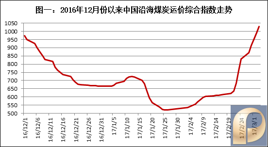 第二,针对环渤海地区的动力煤需求保持增加态势。本报告期,国内海上煤炭运价继续走高,预示针对环渤海地区的动力煤需求保持增加态势。据来自中国煤炭市场网(CCTD)的数据(见图一),中国沿海煤炭运价综合指数保持着2月下旬以来的快速上扬局面,其中,秦皇岛至广州航线5-6万吨、秦皇岛至上海航线4-5万吨两种主力船型,3月3日的平均运价分别为53.1元/吨和43.1元/吨,分别比2月24日大幅上涨了12.6元/吨和9.7元/吨,涨幅也保持在31.1%和29.0%的较高水平;至此,自今年2月21日以来的十天时间,上述两条主要航线、两种主力船型的运价分别上涨了20.4元/吨和18.7元/吨,涨幅高达62.4%和76.6%,动力煤需求复苏之强劲由此可见一斑。