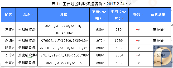 山西地区:节后山西地区价格稳定。潞安、阳煤、晋煤整体库存都保持在偏低水平,生产方面有所控制,在上周会议基本达成短期挺价的共识,目前煤矿方面价格保持不变。地方小矿迫于压力略有回调。现阳泉无烟喷890元,稳。 河南地区:本周延续平稳运行,各大矿均未调价,河南永城无烟喷吹煤车板含税价1070元/吨,焦作无烟喷吹煤车板含税价980元/吨。 河北地区:本周基本都保持平稳。邯矿集团执行承兑价980元/吨。 二、 消费地情况