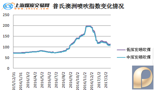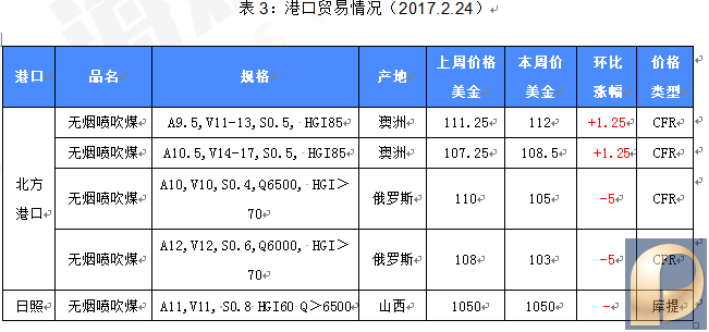 本周进口煤涨跌不一。澳洲煤略有反弹,减弱跌势。俄罗斯继续下跌。俄罗斯双10无烟煤喷吹煤CIF105美元/吨,跌5美元;澳大利亚瘦煤喷吹煤A10.5V14-17报CFR不含税112美元/吨,涨1.25美元。日照港国内无烟喷双11自提含税价1050元/吨。暂时平稳。