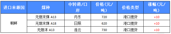 中国商务部和海关总署18日宣布,为执行安理会2321号决议,中国从本月19日起至2017年年末暂停进口朝鲜原产煤炭。 政策出台之后,市场报价混乱,大部分港口价格小涨10元/吨,日照港A12港提现汇不过筛价格为740-745元/吨,大部分贸易商不报价,江内港部分客户报价800元/吨,市场成交一般。 |
