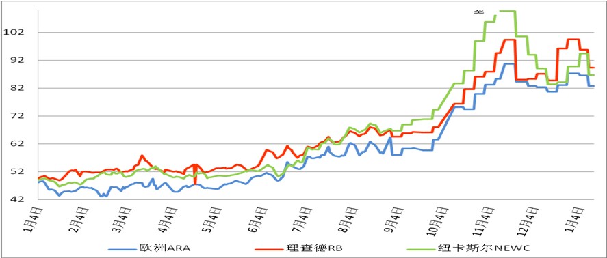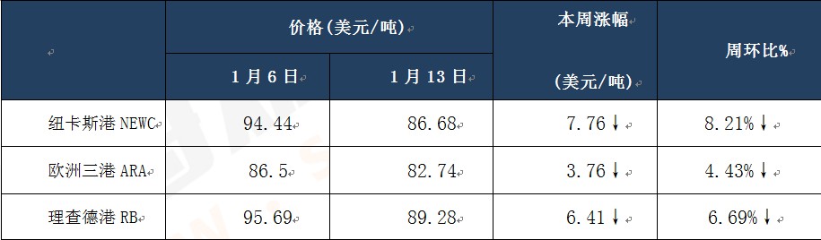 本周国际三港价格春节临近电厂耗煤量下降需求减弱。截至1月13日,欧洲三港ARA指数82.74美元/吨,环比下降3.76美元/吨,澳州NEWC指数96.68美元/吨环比下降7.76美元/吨,南非RB价格指数89.28美元/吨,环比下降6.41美元/吨。