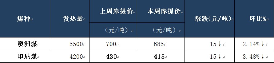 本周进口动力煤市场方面收北方港口价格下调影响。截止1月13日,5500大卡的澳洲煤报价685元/吨, 4200大卡的印尼煤报价415元/吨,本周以下价格均为广州港库提价。