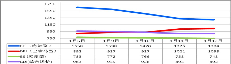 本周国际市场各航线BDI综合指数开始逐步回落。进口煤到中国各港口海运价指数开始回落,同时造船业协会如果船只不减少会出现像2月份的BCI指数的最低点,运输业船只运输依然过剩,海岬型船本周运价受铁矿石回升,巴拿马型船市场上升;超灵便型船市场小幅波动。截止1月12日,BDI较上周下降91点,下降9.25%,海岬型船BCI报收1294点,较上周下降465点。巴拿马型船运指数BPI收报于1038点,较上周上涨201点
