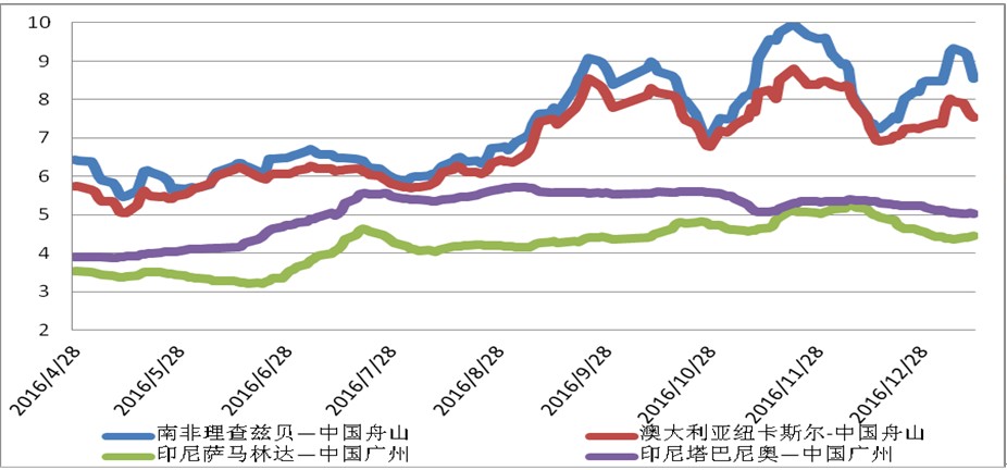 BDI指数与全球经济景气荣枯和原物料行情高低息息相关,本周中国进口干散货运输市场综合指数、运价指数、租金指数趋于利好。分船型来看,海岬型船市场第四季度铁矿石需求旺盛,大宗货品上涨,中国国内煤价高于国际煤价电厂成本偏向国外煤种。本周综合BDI指数892点。导致指数整体原因:春节的临近华南各电厂补库数量不多,中国台湾本周需求强势,预计下周价格会进入弱势。
