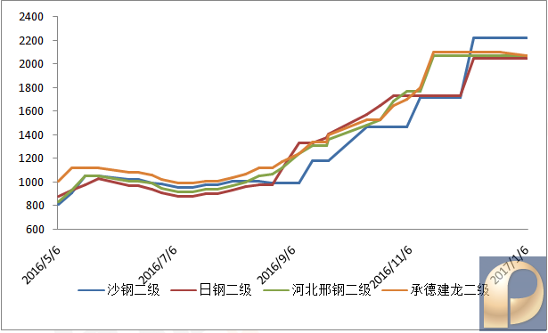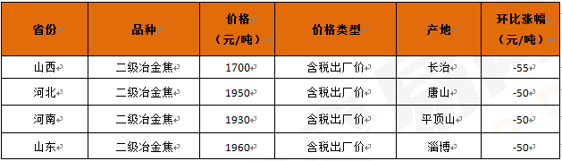 三、产地情况 本周国内焦炭市场整体较强,市场成交情况良好。主产地方面:山西长治二级冶金焦1700元/吨,价格下调55元/吨;河北唐山二级焦1950元/吨,价格下调50元/吨;河南平顶山二级焦1930元/吨,价格下调50元/吨;山东淄博二级焦1960元/吨,价格下调50元/吨。 表2:全国主要焦炭地区企业焦炭价格(2017.01.06)