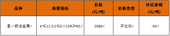 天津港是我国焦炭最大的出口港和南北港口贸易的集散地,也是焦炭、交割的重要交割库之一,截止01月04日,天津港港口库存136.13万吨,库存总体较前段时间依旧呈现震荡下行的趋势,钢企降价意愿强烈,市场观望情绪浓厚。天津港准一级冶金焦平仓价2080元/吨,较上周价格下调40元/吨。 表1:天津港港口焦炭价格含税(2016.01.06)
