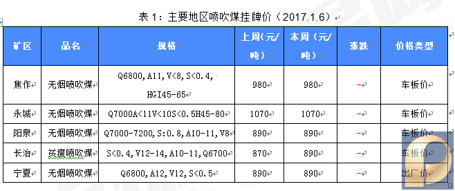 一、总评 本周(1.3-1.6)国内喷吹煤稳中又跌,部分煤矿价格保持平稳,但看跌心态已有,国际价格暴跌后略有回调。河北邯矿1月起下调60元/吨,其他主流大矿潞安集团、阳煤、晋煤、宁煤、焦作煤业、永城煤业等目前均保持平稳,听闻山西某大矿已有与下游商议降价事宜的心态,表明目前喷吹煤朝不保夕的现状。煤矿方面生产临近年底生产积极性下降,部分库存较高企业可能有降价心态,下游方面,钢厂库存高位,不急于采购,要求煤企缓发现象增多。年前供需两弱,部分库存高企的煤企可能仍将下调喷吹煤价格。 二、 产地情况