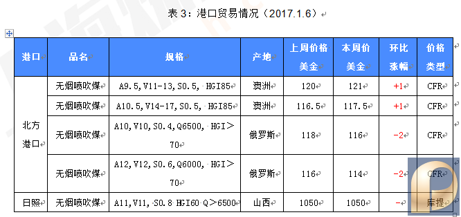 本周进口煤在将近77美元的暴跌后,短期到达底部,本周略有回弹,幅度仅1美元左右,俄罗斯双10无烟煤喷吹煤CIF116美元/吨,跌2美元;澳大利亚瘦煤喷吹煤A10.5V14-17报CFR不含税117.5美元/吨,涨1美元。日照港国内无烟喷双11自提含税价1050元/吨。暂时平稳。