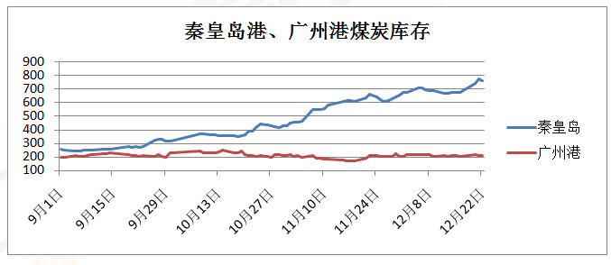 图1 秦皇岛港、广州港煤炭库存